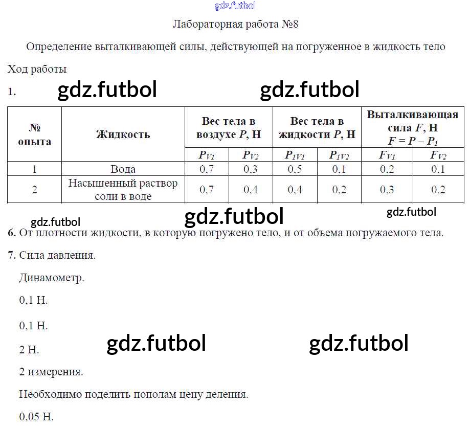 Готовые домашние задания по Физике за 7 класс Минькова Тетрадь для лабораторных работ УМК 2017 ФГОС - Лабораторные работы ЛР №8. Определение выталкивающей силы действующей на погруженное в жидкость тело