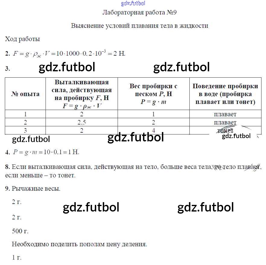Готовые домашние задания по Физике за 7 класс Минькова Тетрадь для лабораторных работ УМК 2017 ФГОС - Лабораторные работы ЛР №9. Выяснение условий плавания тела в жидкости