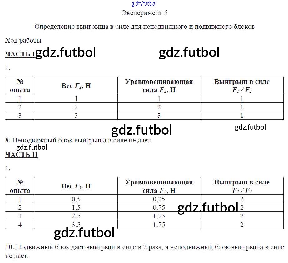 Готовые домашние задания по Физике за 7 класс Минькова Тетрадь для лабораторных работ УМК 2017 ФГОС - Эксперименты Эксперимент 5. Определение выигрыша в силе для подвижного и неподвижного блоков