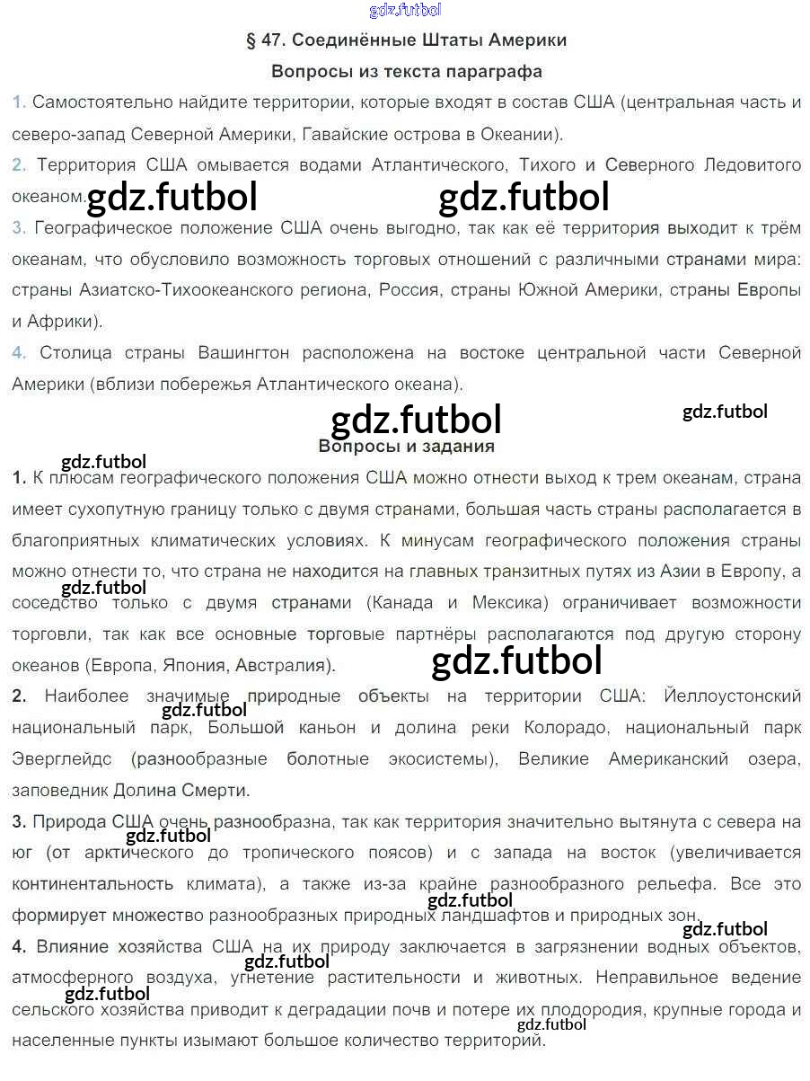Готовые решения задач (ГДЗ) по Географии седьмой класс Коринская, Душина Учебник 2017 ФГОС - Параграфы 47 доступны для различных учебных материалов. У нас вы сможете найти авторские решения для всех пособий, предназначенных для школьников. Не секрет, что в настоящее время многие школьники прибегают к использованию готовых решебников, ведь они содержат подробные ответы для каждого упражнения, представленного в учебнике.