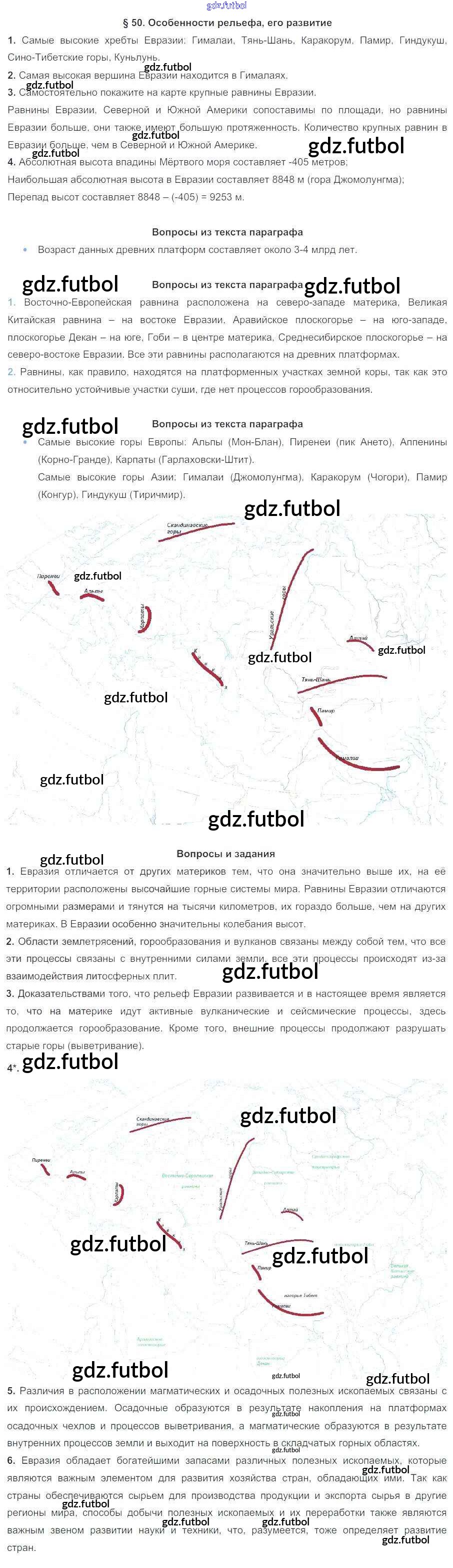 Готовые решения задач (ГДЗ) по Географии седьмой класс Коринская, Душина Учебник 2017 ФГОС - Параграфы 50 доступны для различных учебных материалов. У нас вы сможете найти авторские решения для всех пособий, предназначенных для школьников. Не секрет, что в настоящее время многие школьники прибегают к использованию готовых решебников, ведь они содержат подробные ответы для каждого упражнения, представленного в учебнике.