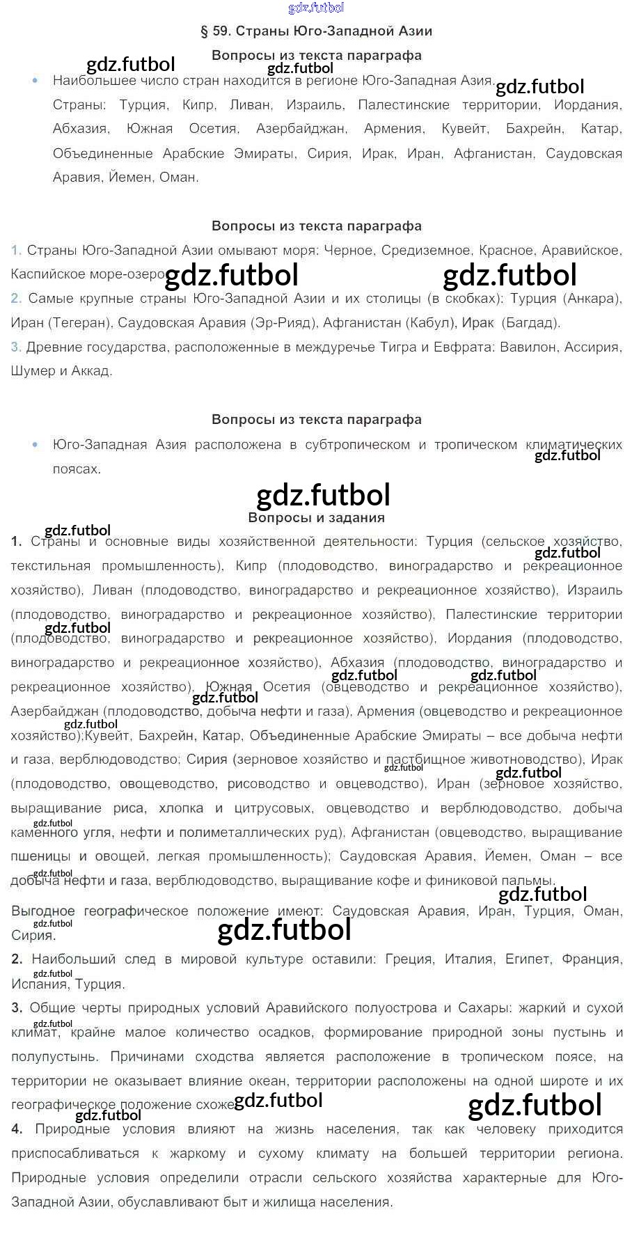 Готовые решения задач (ГДЗ) по Географии седьмой класс Коринская, Душина Учебник 2017 ФГОС - Параграфы 59 доступны для различных учебных материалов. У нас вы сможете найти авторские решения для всех пособий, предназначенных для школьников. Не секрет, что в настоящее время многие школьники прибегают к использованию готовых решебников, ведь они содержат подробные ответы для каждого упражнения, представленного в учебнике.