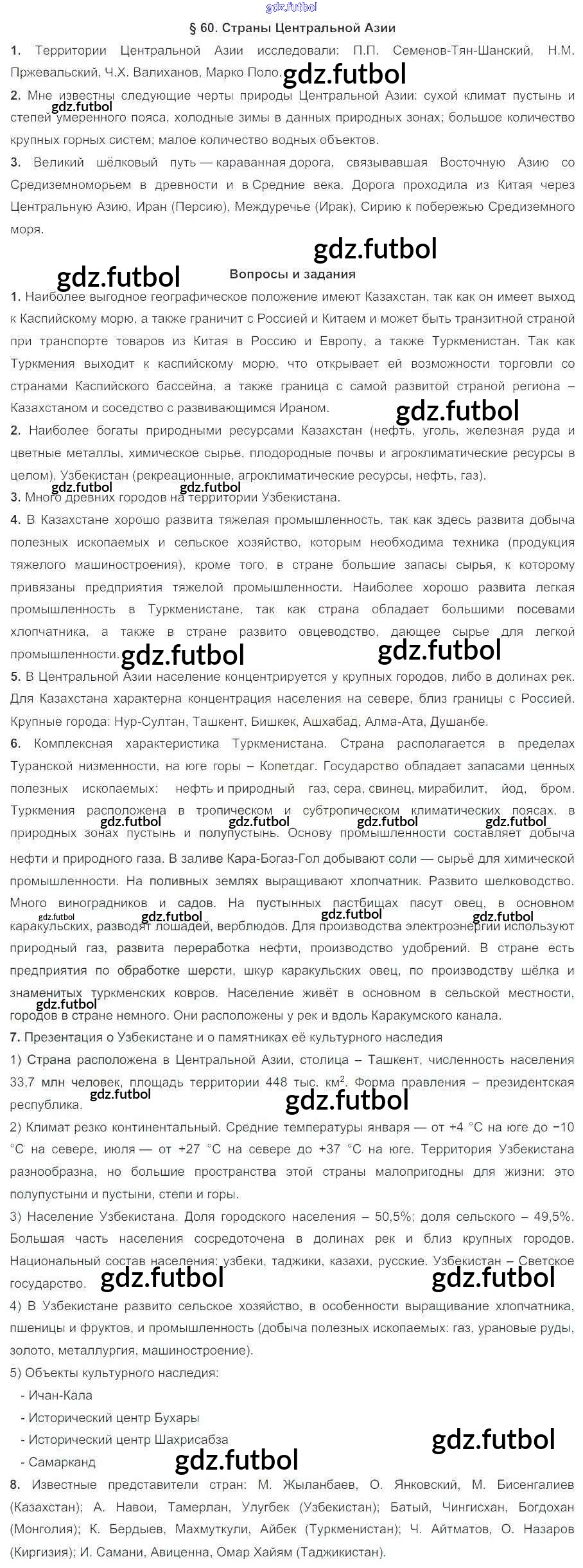 Готовые решения задач (ГДЗ) по Географии седьмой класс Коринская, Душина Учебник 2017 ФГОС - Параграфы 60 доступны для различных учебных материалов. У нас вы сможете найти авторские решения для всех пособий, предназначенных для школьников. Не секрет, что в настоящее время многие школьники прибегают к использованию готовых решебников, ведь они содержат подробные ответы для каждого упражнения, представленного в учебнике.