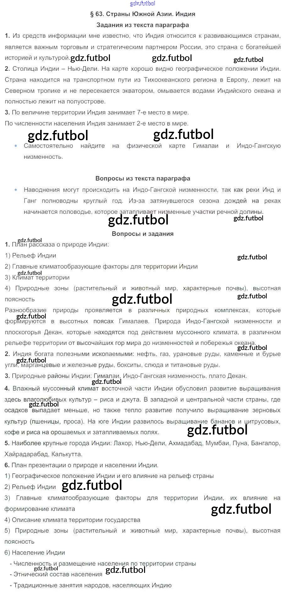 Готовые решения задач (ГДЗ) по Географии седьмой класс Коринская, Душина Учебник 2017 ФГОС - Параграфы 63 доступны для различных учебных материалов. У нас вы сможете найти авторские решения для всех пособий, предназначенных для школьников. Не секрет, что в настоящее время многие школьники прибегают к использованию готовых решебников, ведь они содержат подробные ответы для каждого упражнения, представленного в учебнике.