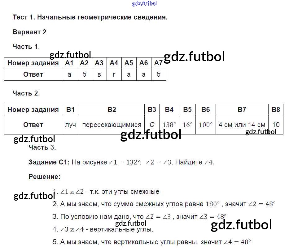 Готовые решения задач (ГДЗ) по Геометрии седьмой класс Фарков Тесты УМК 2015 ФГОС - Глава 1. Варианты 2 доступны для различных учебных материалов. У нас вы сможете найти авторские решения для всех пособий, предназначенных для школьников. Не секрет, что в настоящее время многие школьники прибегают к использованию готовых решебников, ведь они содержат подробные ответы для каждого упражнения, представленного в учебнике.