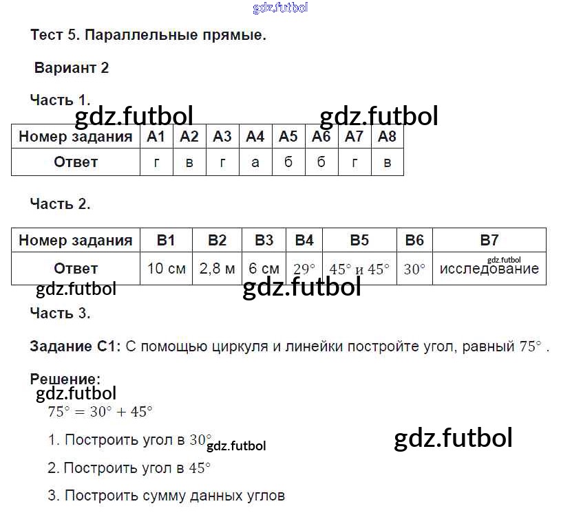 Готовые решения задач (ГДЗ) по Геометрии седьмой класс Фарков Тесты УМК 2015 ФГОС - Глава 5. Варианты 2 доступны для различных учебных материалов. У нас вы сможете найти авторские решения для всех пособий, предназначенных для школьников. Не секрет, что в настоящее время многие школьники прибегают к использованию готовых решебников, ведь они содержат подробные ответы для каждого упражнения, представленного в учебнике.