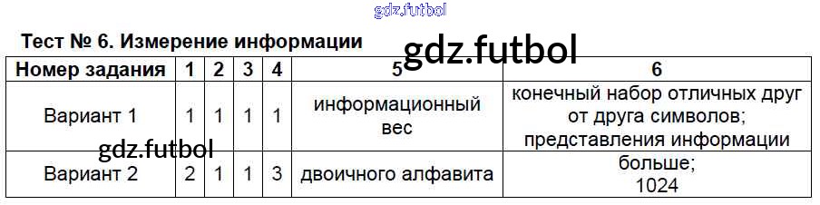 Готовые домашние задания по Информатике за 7 класс Масленикова Контрольно-измерительные материалы (КИМ) 2017 ФГОС - Тесты Тест №6. Измерение информации