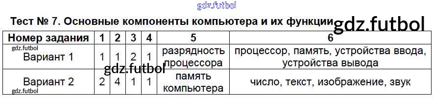 Готовые домашние задания по Информатике за 7 класс Масленикова Контрольно-измерительные материалы (КИМ) 2017 ФГОС - Тесты Тест №7. Основные компоненты компьютера и их функции