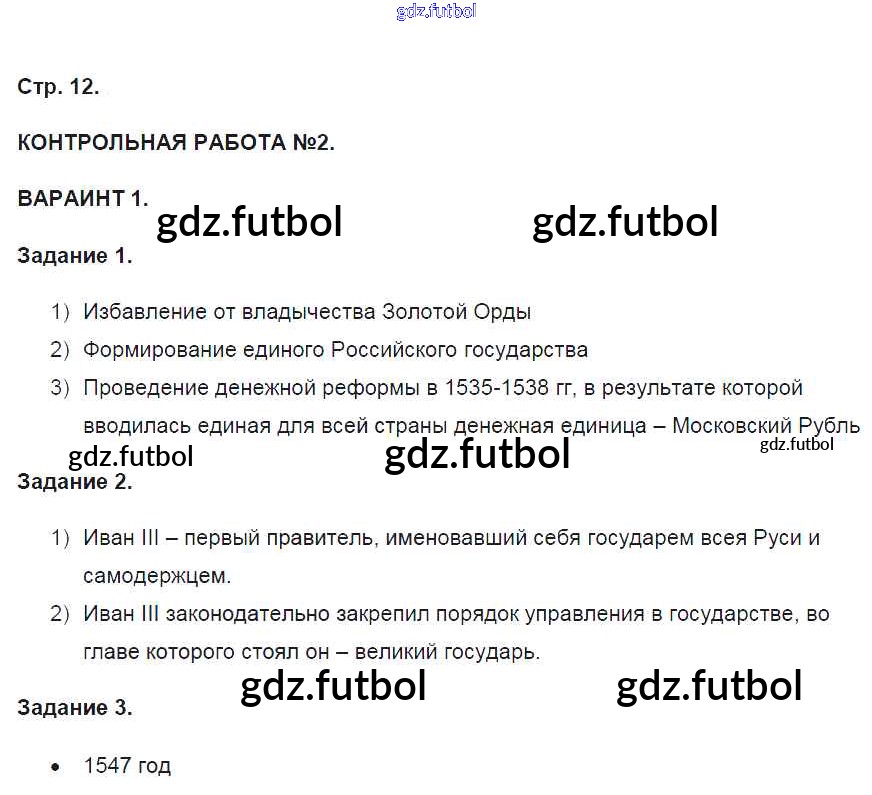 Готовые решения задач (ГДЗ) по Истории седьмой класс Артасов Контрольные работы УМК 2016 ФГОС - Страницы 12 доступны для различных учебных материалов. У нас вы сможете найти авторские решения для всех пособий, предназначенных для школьников. Не секрет, что в настоящее время многие школьники прибегают к использованию готовых решебников, ведь они содержат подробные ответы для каждого упражнения, представленного в учебнике.