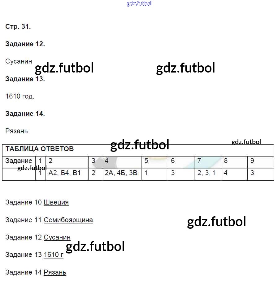 Готовые решения задач (ГДЗ) по Истории седьмой класс Артасов Контрольные работы УМК 2016 ФГОС - Страницы 31 доступны для различных учебных материалов. У нас вы сможете найти авторские решения для всех пособий, предназначенных для школьников. Не секрет, что в настоящее время многие школьники прибегают к использованию готовых решебников, ведь они содержат подробные ответы для каждого упражнения, представленного в учебнике.