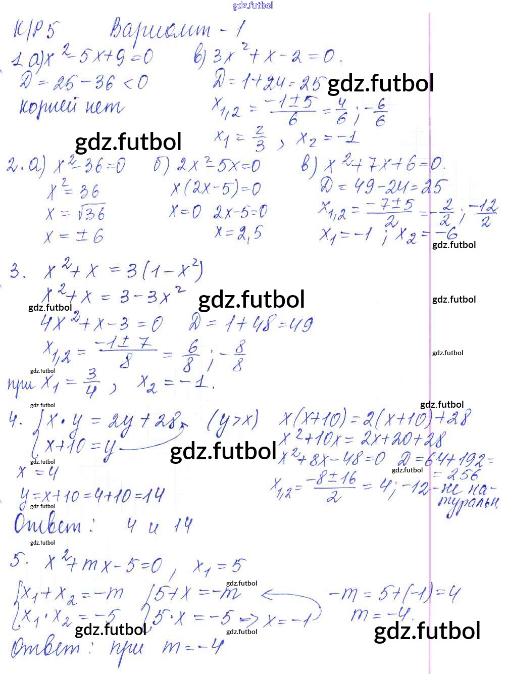 Готовые домашние задания по Алгебре за 8 класс Дудницын Контрольные работы УМК 2010 ФГОС - КР-5. Квадратные уравнения. Варианты 1