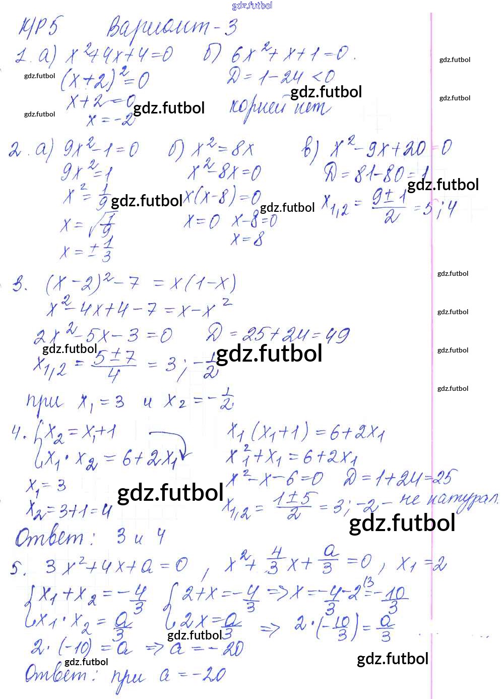 Готовые домашние задания по Алгебре за 8 класс Дудницын Контрольные работы УМК 2010 ФГОС - КР-5. Квадратные уравнения. Варианты 3