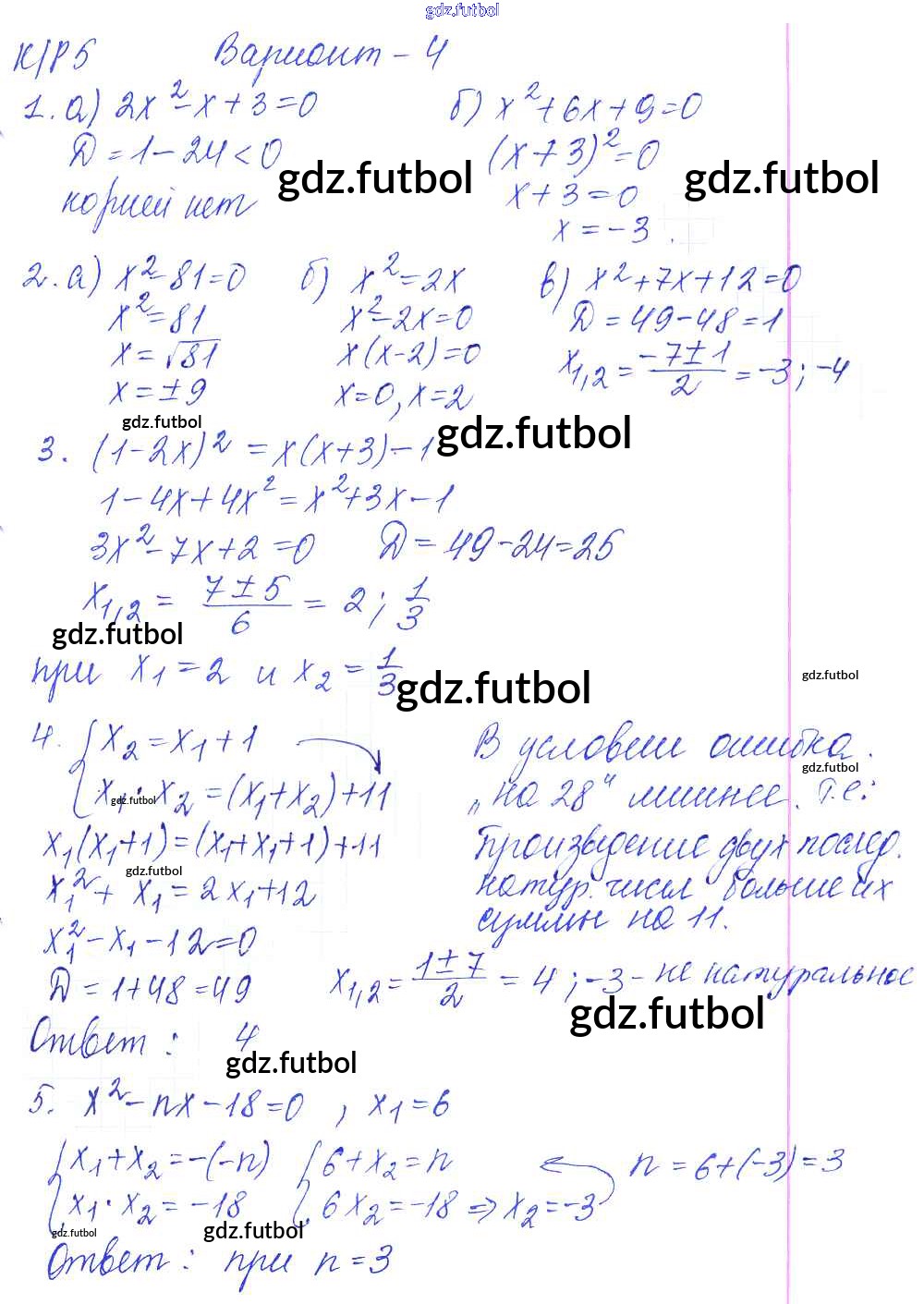 Готовые домашние задания по Алгебре за 8 класс Дудницын Контрольные работы УМК 2010 ФГОС - КР-5. Квадратные уравнения. Варианты 4