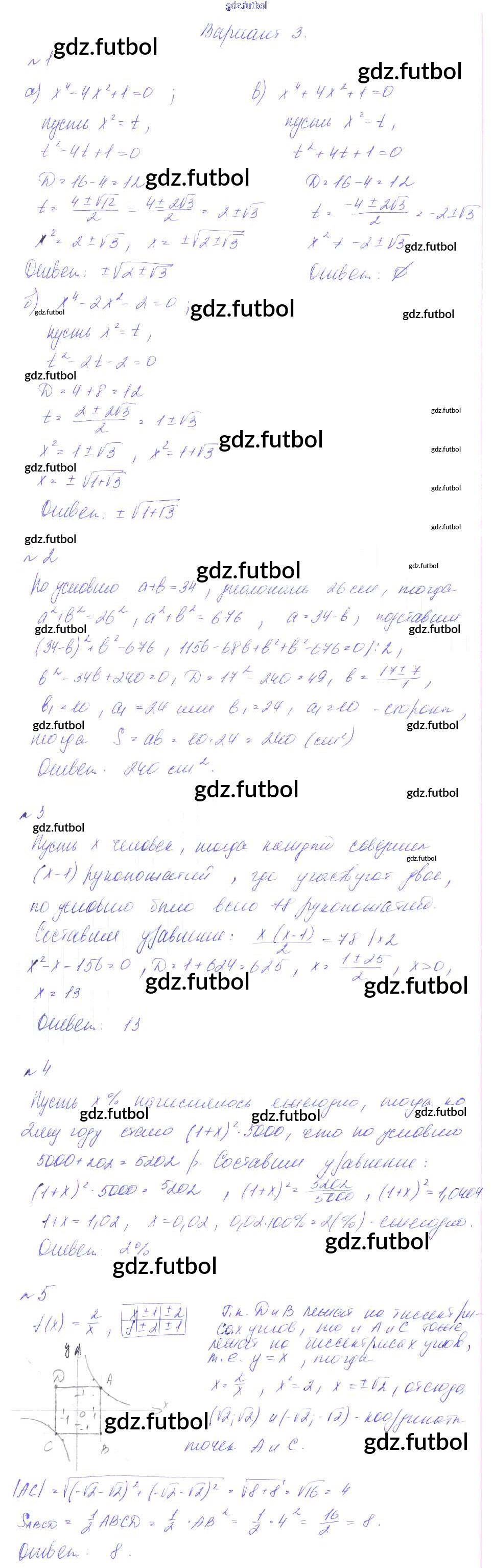 Готовые домашние задания по Алгебре за 8 класс Феоктистов Дидактические материалы 2013 ФГОС - СР-14. Биквадратные уравнения. Решение задач с помощью квадратных уравнений вариант 3