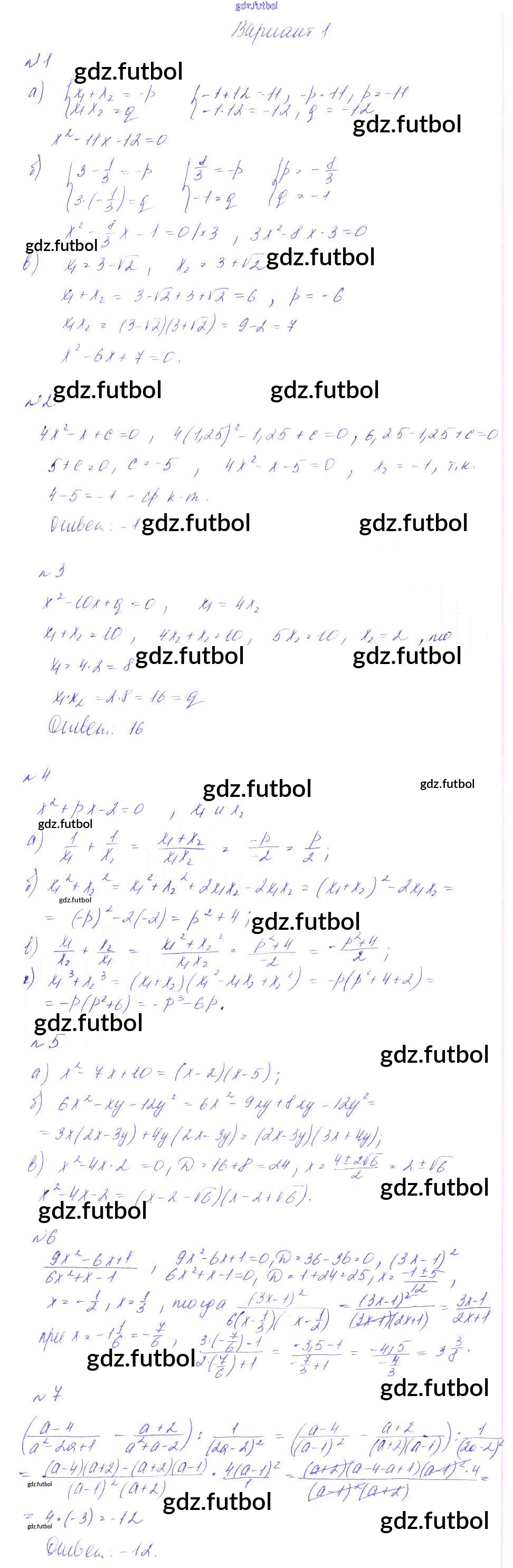 Готовые домашние задания по Алгебре за 8 класс Феоктистов Дидактические материалы 2013 ФГОС - СР-15. Свойство корней квадратного уравнения, симметрические многочлены, разложение квадратного трехчлена на множ вариант 1