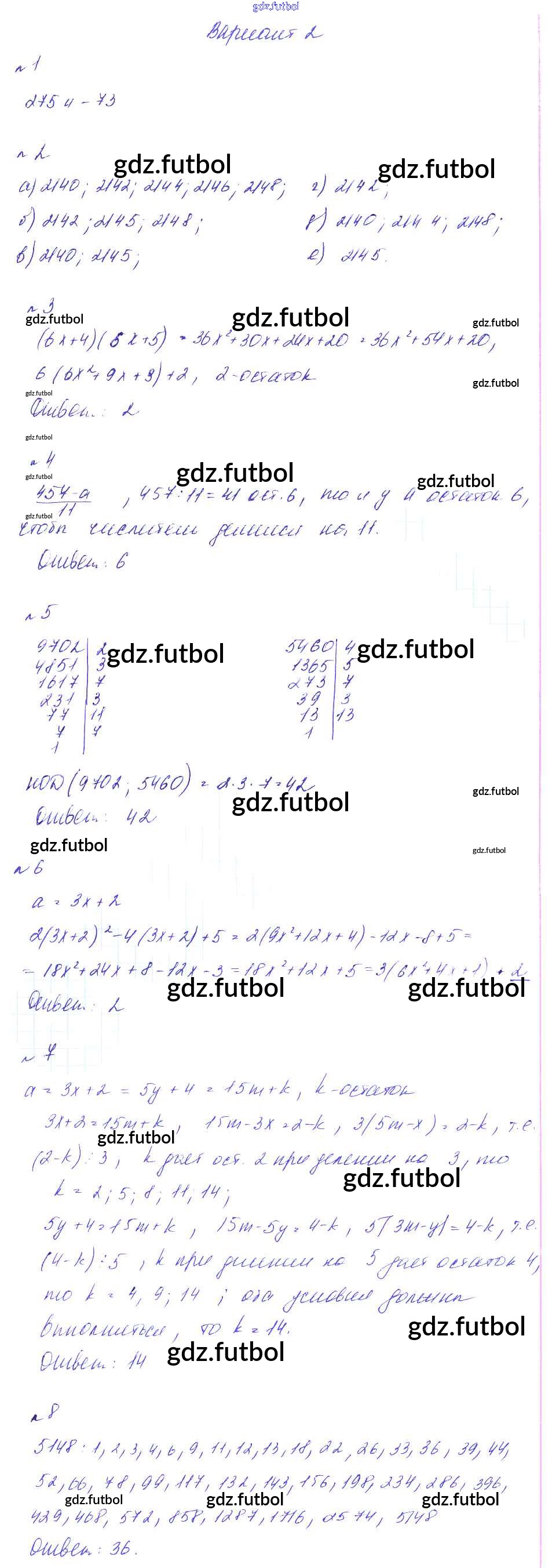 Готовые домашние задания по Алгебре за 8 класс Феоктистов Дидактические материалы 2013 ФГОС - СР-8. Деление с остатком, признаки делимости, простые и составные числа вариант 2