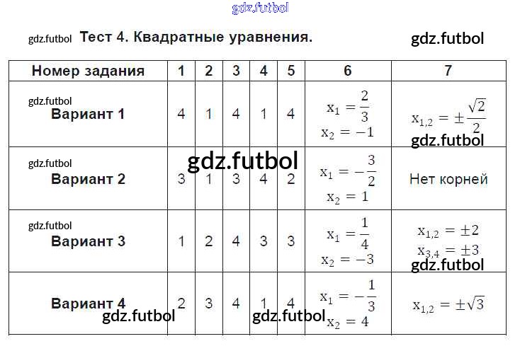 Готовые решения задач (ГДЗ) по Алгебре восьмой класс Ткачева Тематические тесты 2018 ФГОС - Тесты 4 доступны для различных учебных материалов. У нас вы сможете найти авторские решения для всех пособий, предназначенных для школьников. Не секрет, что в настоящее время многие школьники прибегают к использованию готовых решебников, ведь они содержат подробные ответы для каждого упражнения, представленного в учебнике.