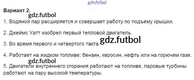 Готовые домашние задания по Физике за 8 класс Громцева Контрольные и самостоятельные работы УМК 2017 ФГОС - СР №20. Работа газа и пара при расширении. Двигатель внутреннего сгорания. Паровая турбина вариант-2