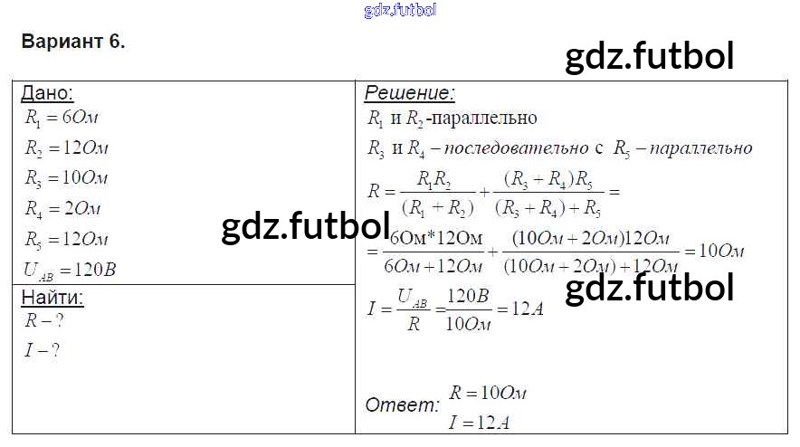 Готовые домашние задания по Физике за 8 класс Громцева Контрольные и самостоятельные работы УМК 2017 ФГОС - СР №35. Последовательное и параллельное соединение проводников. Расчет полного сопротивления и силы тока в цепи вариант-6
