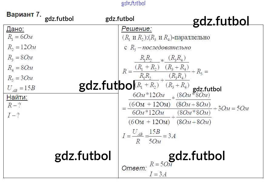 Готовые домашние задания по Физике за 8 класс Громцева Контрольные и самостоятельные работы УМК 2017 ФГОС - СР №35. Последовательное и параллельное соединение проводников. Расчет полного сопротивления и силы тока в цепи вариант-7