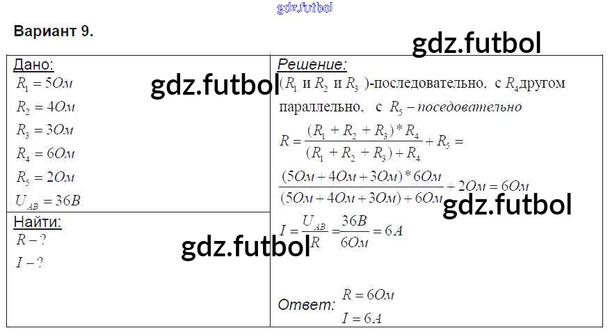 Готовые домашние задания по Физике за 8 класс Громцева Контрольные и самостоятельные работы УМК 2017 ФГОС - СР №35. Последовательное и параллельное соединение проводников. Расчет полного сопротивления и силы тока в цепи вариант-9