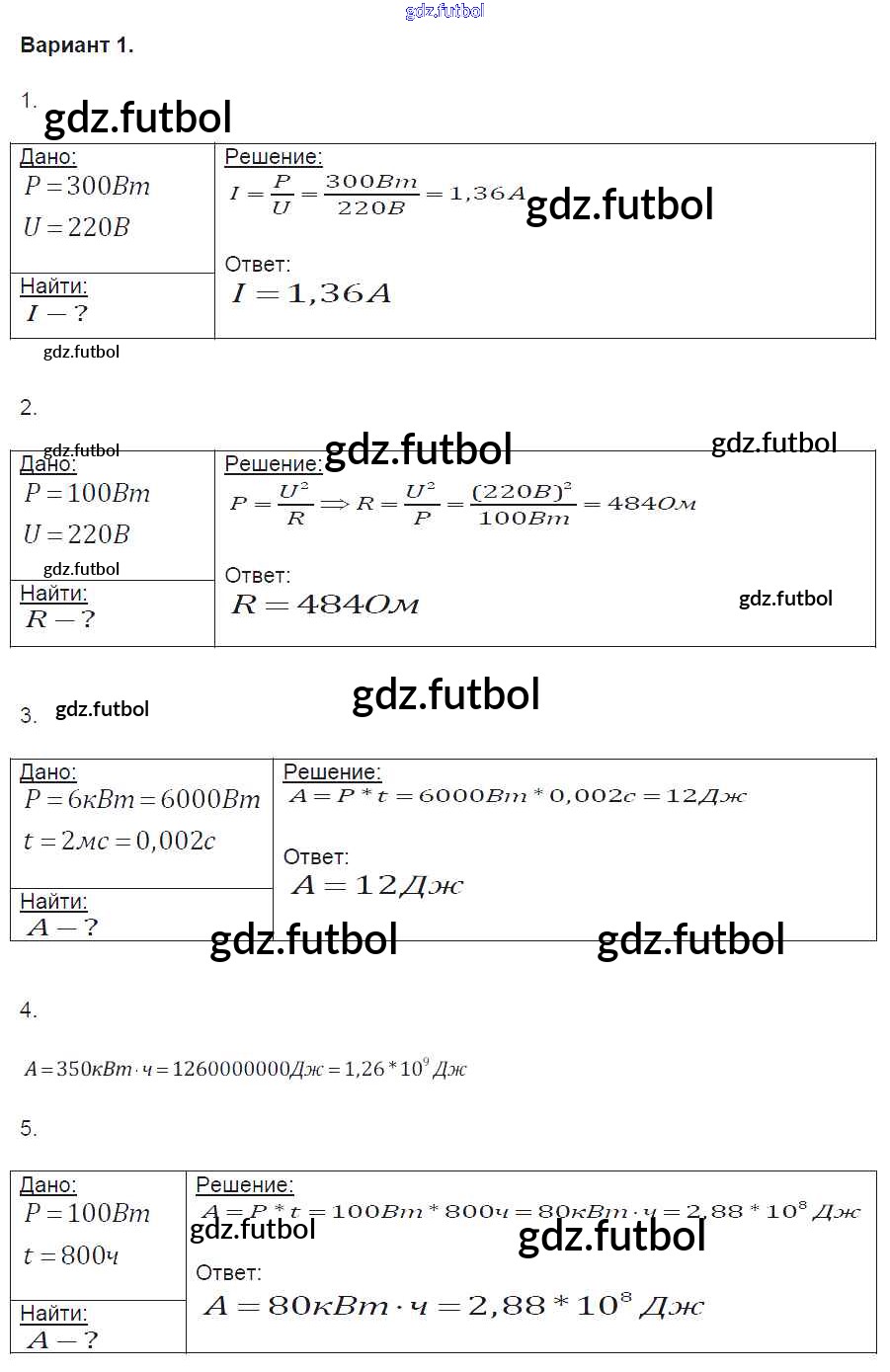 Готовые домашние задания по Физике за 8 класс Громцева Контрольные и самостоятельные работы УМК 2017 ФГОС - СР №37. Работа и мощность электрического тока вариант-1