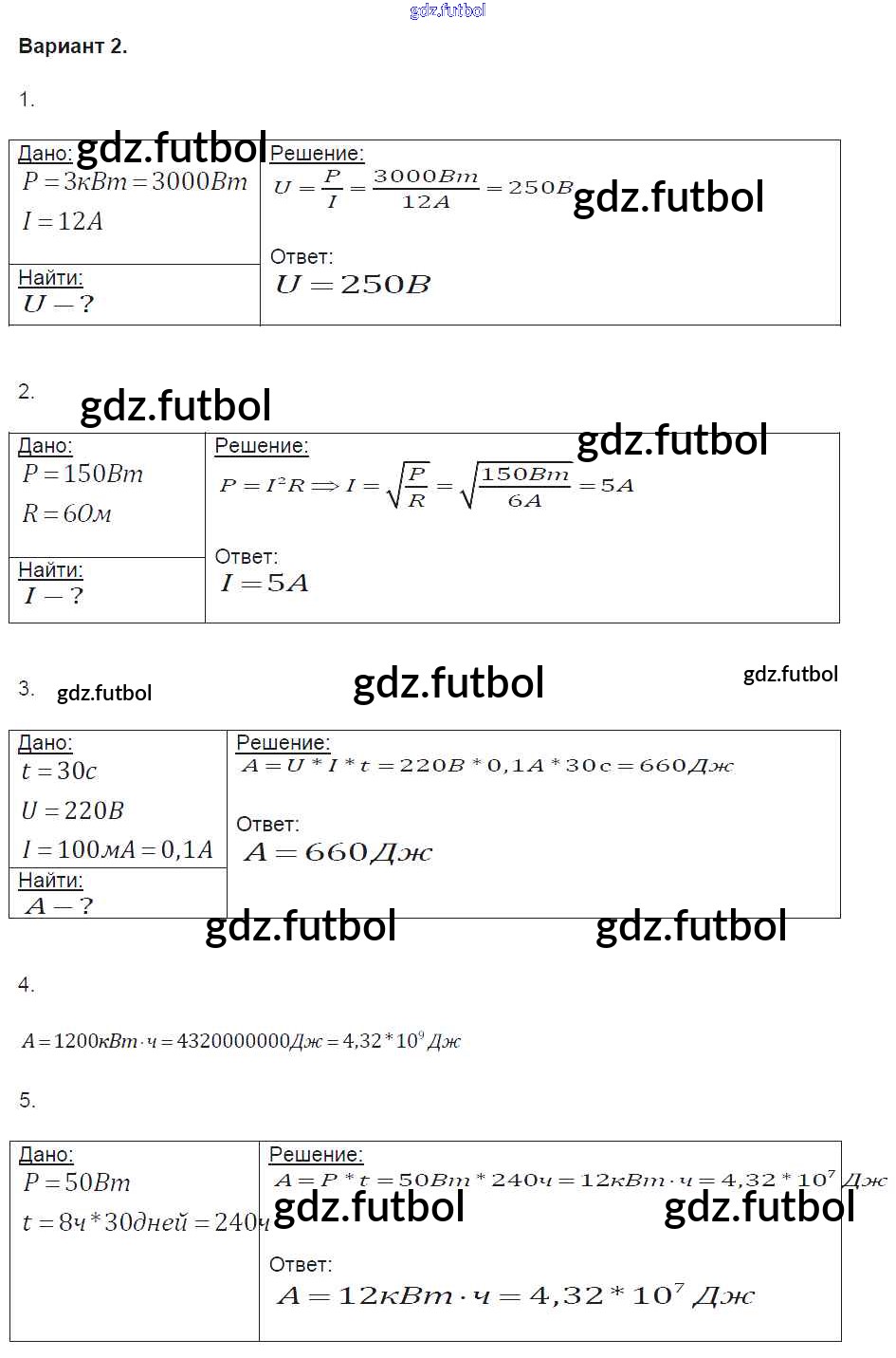 Готовые домашние задания по Физике за 8 класс Громцева Контрольные и самостоятельные работы УМК 2017 ФГОС - СР №37. Работа и мощность электрического тока вариант-2