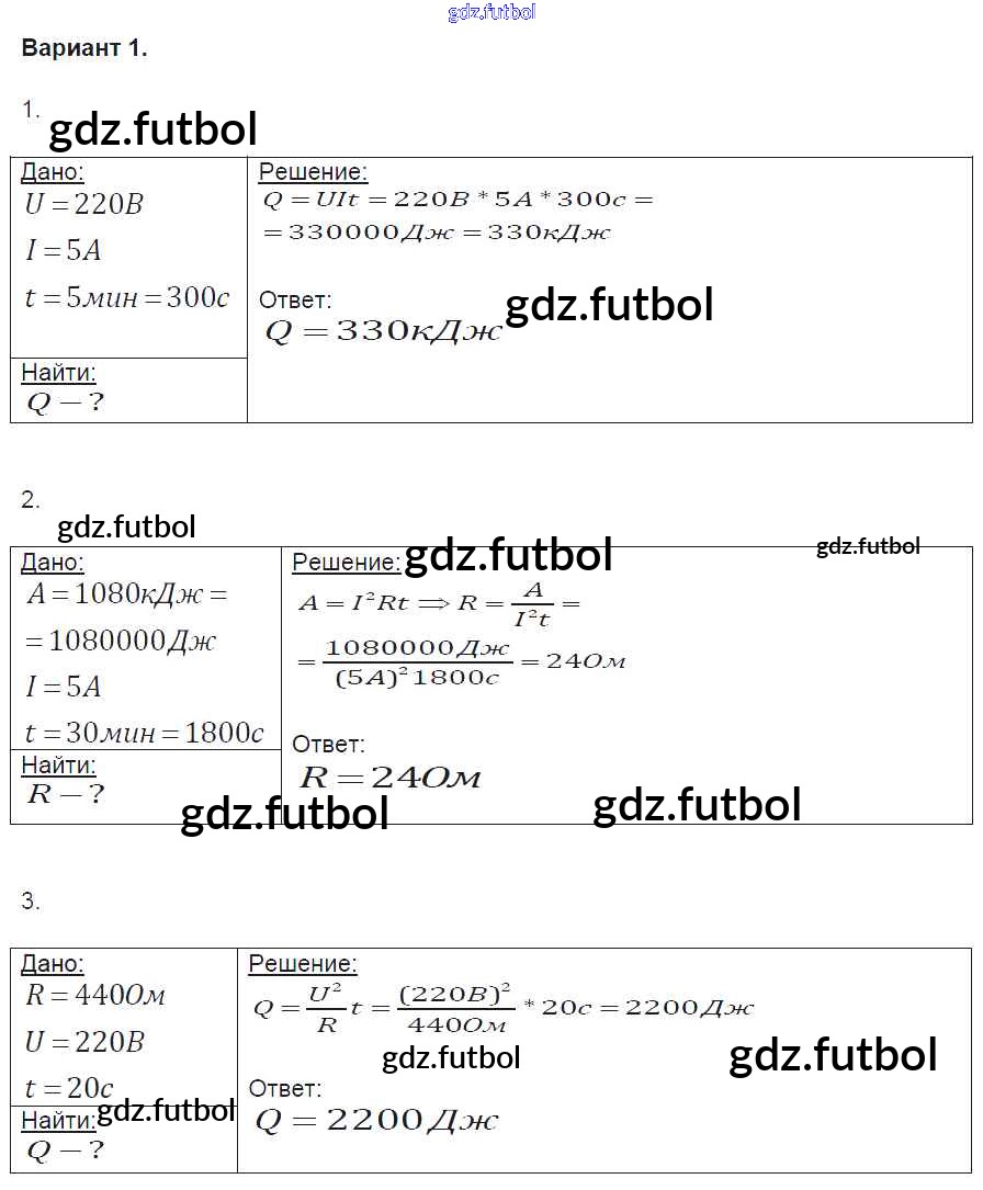 Готовые домашние задания по Физике за 8 класс Громцева Контрольные и самостоятельные работы УМК 2017 ФГОС - СР №38. Нагревание проводников электрическим током. Закон Джоуля-Ленца вариант-1