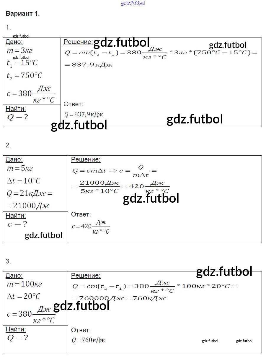 Готовые домашние задания по Физике за 8 класс Громцева Контрольные и самостоятельные работы УМК 2017 ФГОС - СР №6. Количество теплоты. Удельная теплоемкость. Расчет количества теплоты вариант-1