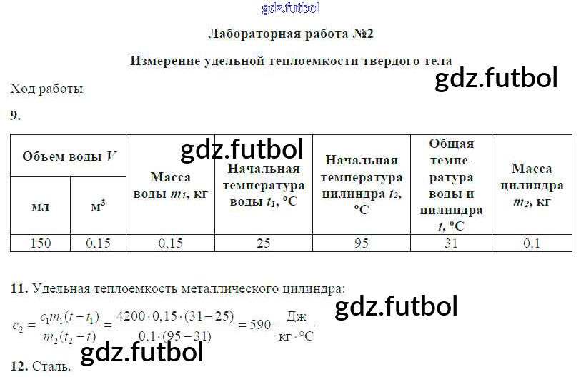 Готовые домашние задания по Физике за 8 класс Громов Учебник 2018 ФГОС - Лабораторные работы ЛР №2. Измерение удельной теплоемкости твердого тела