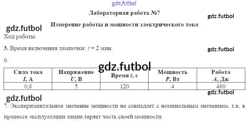 Готовые домашние задания по Физике за 8 класс Громов Учебник 2018 ФГОС - Лабораторные работы ЛР №7. Измерение работы и мощности электрического тока