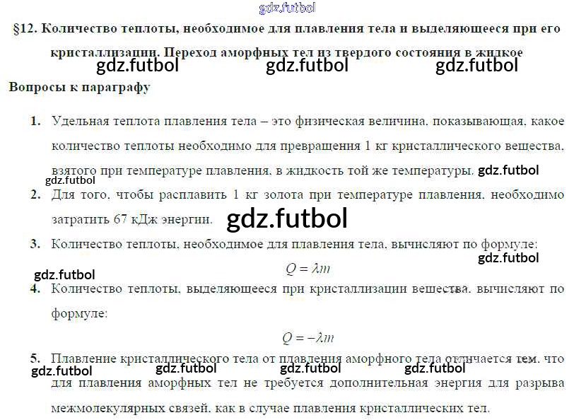 Готовые домашние задания по Физике за 8 класс Громов Учебник 2018 ФГОС - Параграфы § 12. Количество теплоты, необходимое для плавления тела и выделяющееся при его кристаллизации