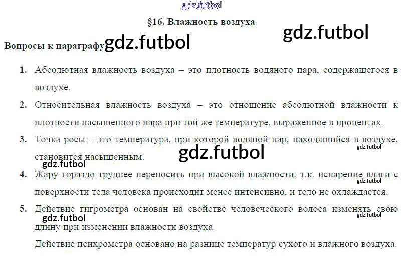 Готовые домашние задания по Физике за 8 класс Громов Учебник 2018 ФГОС - Параграфы § 16. Влажность воздуха