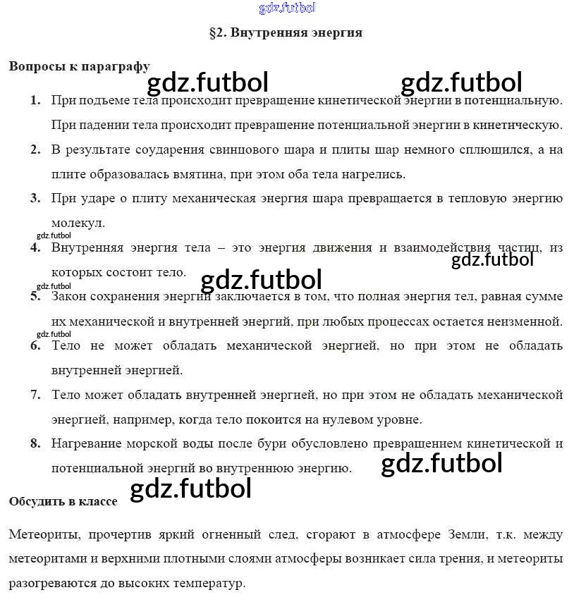 Готовые домашние задания по Физике за 8 класс Громов Учебник 2018 ФГОС - Параграфы § 2. Внутренняя энергия