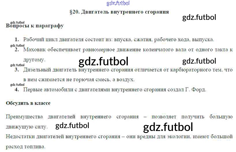 Готовые домашние задания по Физике за 8 класс Громов Учебник 2018 ФГОС - Параграфы § 20. Двигатель внутреннего сгорания