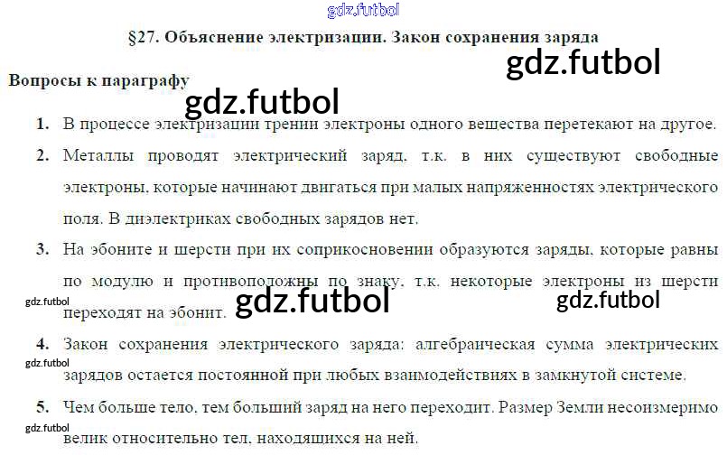 Готовые домашние задания по Физике за 8 класс Громов Учебник 2018 ФГОС - Параграфы § 27. Объяснение электризации. Закон сохранения заряда