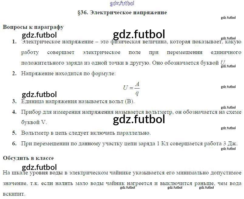 Готовые домашние задания по Физике за 8 класс Громов Учебник 2018 ФГОС - Параграфы § 36. Электрическое напряжение