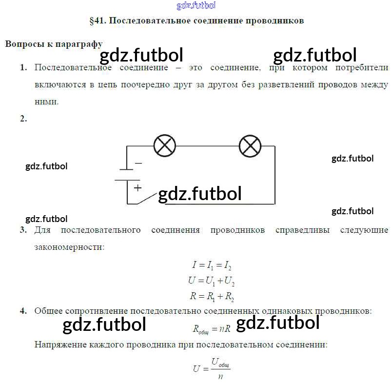 Готовые домашние задания по Физике за 8 класс Громов Учебник 2018 ФГОС - Параграфы § 41. Последовательное соединение проводников