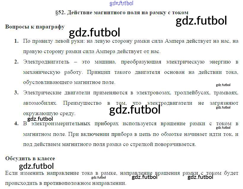 Готовые домашние задания по Физике за 8 класс Громов Учебник 2018 ФГОС - Параграфы § 52. Действие магнитного поля на рамку с током
