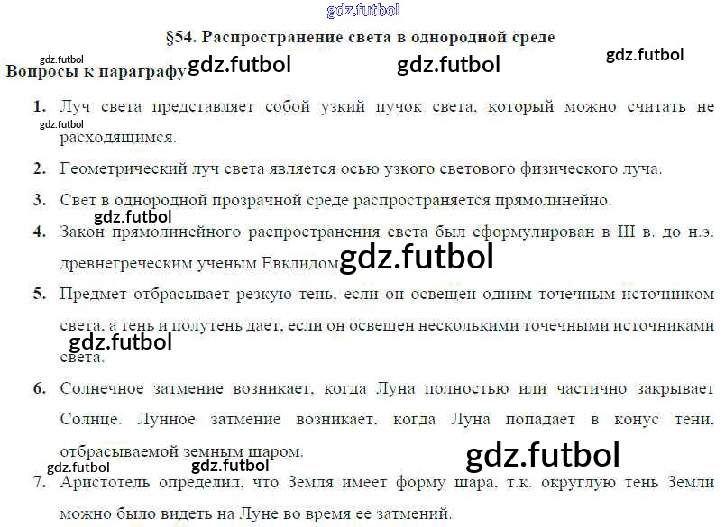 Готовые домашние задания по Физике за 8 класс Громов Учебник 2018 ФГОС - Параграфы § 54. Распространение света в однородной среде