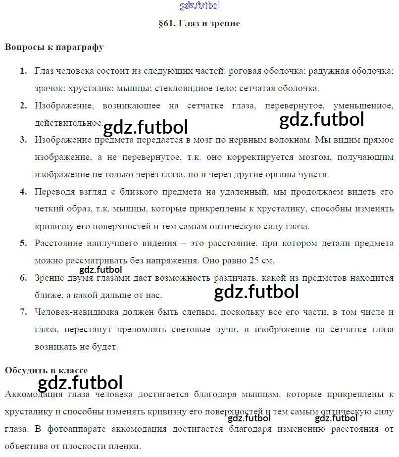 Готовые домашние задания по Физике за 8 класс Громов Учебник 2018 ФГОС - Параграфы § 61. Глаз и зрение