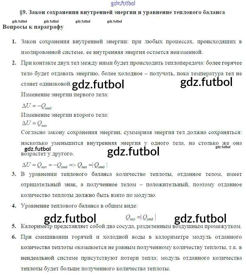 Готовые домашние задания по Физике за 8 класс Громов Учебник 2018 ФГОС - Параграфы § 9. Закон сохранения внутренней энергии и уравнение теплового баланса