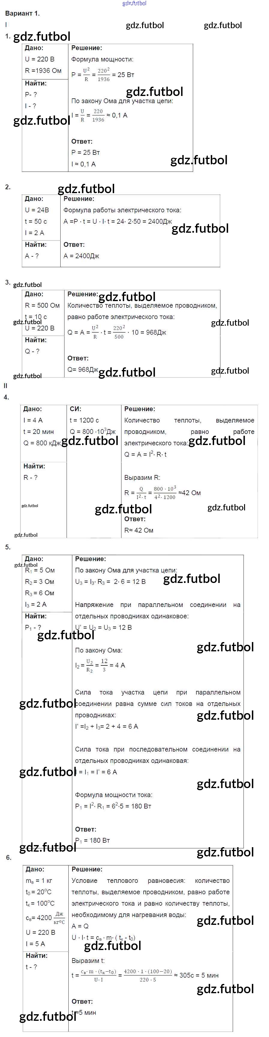 Готовые домашние задания по Физике за 8 класс Марон Дидактические материалы Вертикаль 2016 ФГОС - КР №4. Работа и мощность тока. Варианты 1
