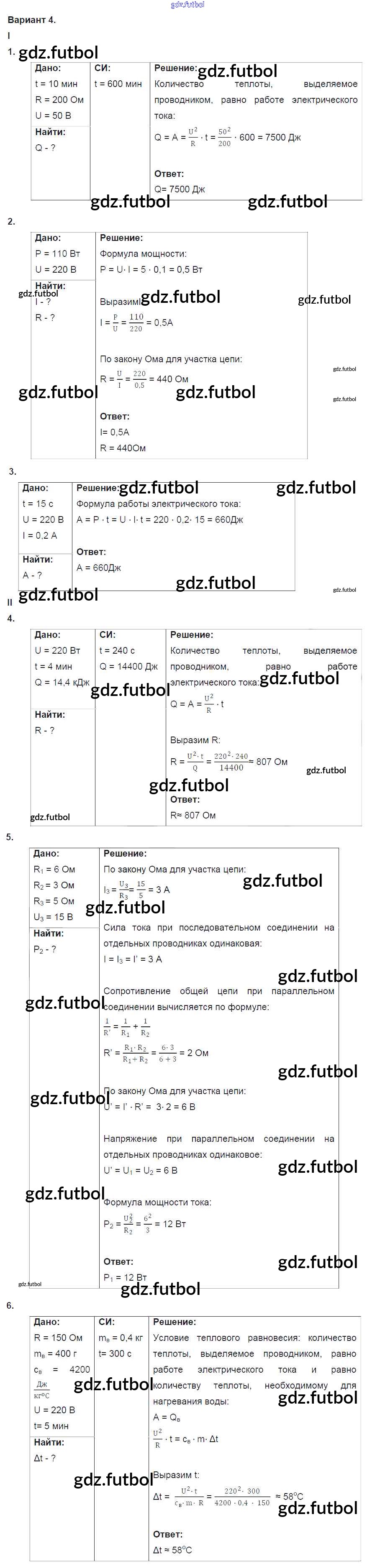 Готовые домашние задания по Физике за 8 класс Марон Дидактические материалы Вертикаль 2016 ФГОС - КР №4. Работа и мощность тока. Варианты 4