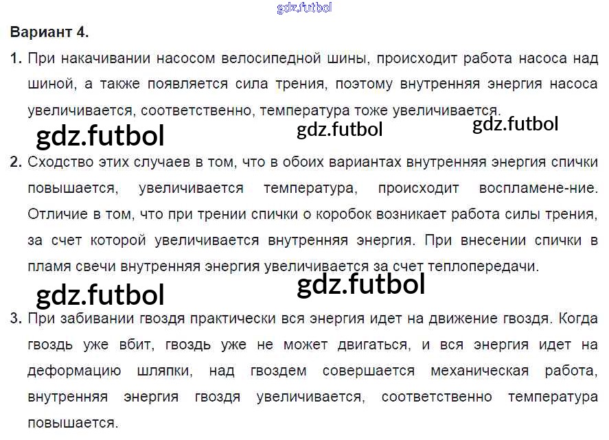 Готовые домашние задания по Физике за 8 класс Марон Дидактические материалы Вертикаль 2016 ФГОС - СР №1. Внутренняя энергия. Варианты 4