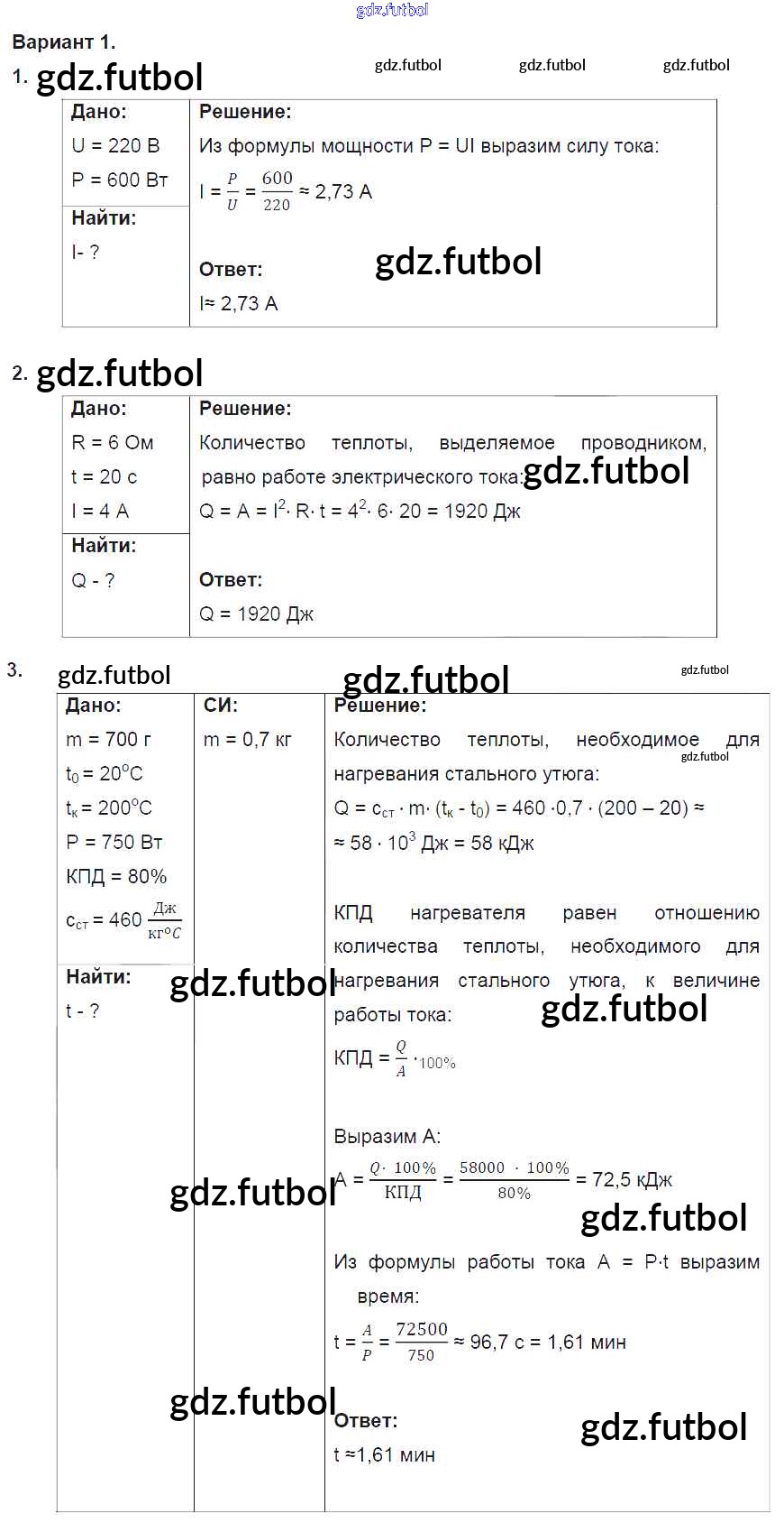Готовые домашние задания по Физике за 8 класс Марон Дидактические материалы Вертикаль 2016 ФГОС - СР №10. Работа и мощность тока. Варианты 1