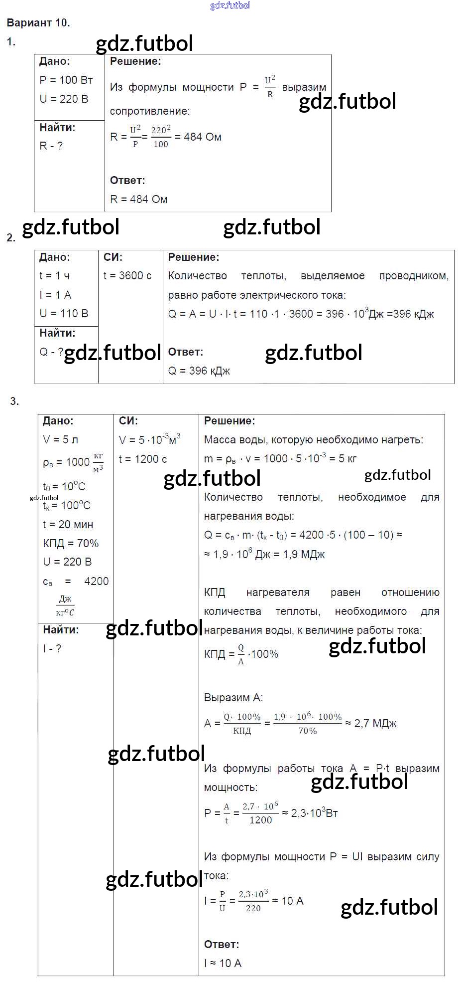 Готовые домашние задания по Физике за 8 класс Марон Дидактические материалы Вертикаль 2016 ФГОС - СР №10. Работа и мощность тока. Варианты 10