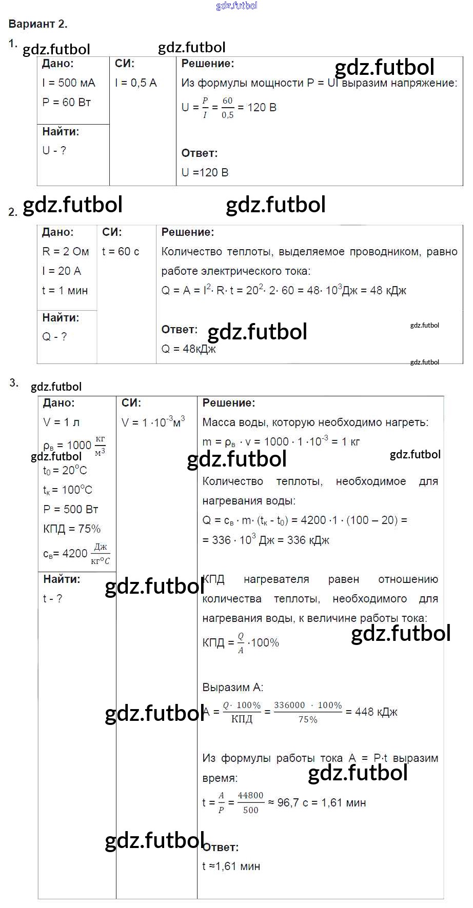 Готовые домашние задания по Физике за 8 класс Марон Дидактические материалы Вертикаль 2016 ФГОС - СР №10. Работа и мощность тока. Варианты 2