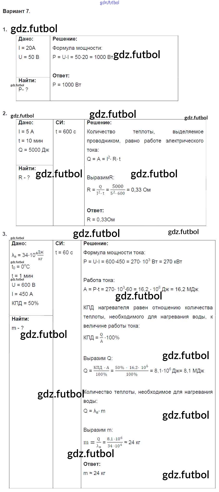 Готовые домашние задания по Физике за 8 класс Марон Дидактические материалы Вертикаль 2016 ФГОС - СР №10. Работа и мощность тока. Варианты 7