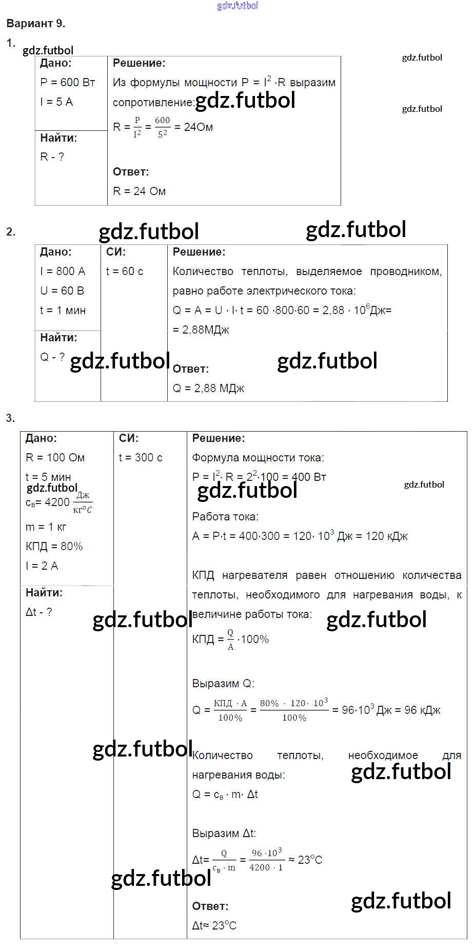 Готовые домашние задания по Физике за 8 класс Марон Дидактические материалы Вертикаль 2016 ФГОС - СР №10. Работа и мощность тока. Варианты 9